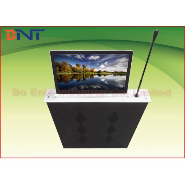 BNT series integrated LCD Monitor Screen Automatic Lifting Mechanism, a modern designed for the high-class conference room audio-video solutions. When ordinary meeting, the monitor is inside the LCD monitor lift to keep the tabletop even and neat; when multimedia meeting, the monitor can be lift up separately. All LCD display the multimedia information including meeting content, information hint and picture information,sound, video and audio. The lift with screen adopts synchronous orbit lifting principle. It runs monitor lifting smoothly, quietly, and provided with the protection function for LCD monitors by cutting the power off automatically. The panel switch adopts the durable and excellent material’s nice-looking touch switch.